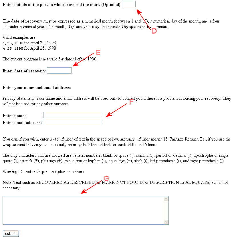 For "A" you enter the PID from the NGS Datasheet ("A"), "B" is the condition of the mark (note the special attention for Destroyed), you can select GEOCAC for "C" - this will also be recorded in the NGS Datasheet (at "C"), if you enter your initials in "D" they will be recorded in the NGS Datasheet (at "C") , "E" is the date (note the format), "F" is you name and email address (note why they ask), "G" is any additional information you want to provide in the database, like the road name changed, the distance has changed, etc. - these comments will be entered in the NGS Datasheet (at "D"). After hitting Submit, and verifying your PID, you will be asked about satellite coverage: