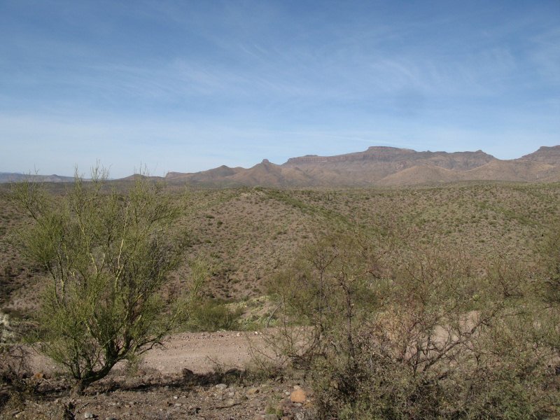 The Trail:We entered this area when we were out Benchmarking. There are old workings scattered throughout the area and unmarked roads crisscross the mountains. We tried to stick to the trails on our GPSr and maps, but still ran into some main roads that are now blocked by locked gates. The trails are primarily dirt roads that are rough and rocky in some stretches. Rating:2.0 Runs:Date: 10/30/2009Suspension: TeraFlex 2.5" Spring Lift, BFG 35x12.50x17Photos:A view from the access road heading into the area: