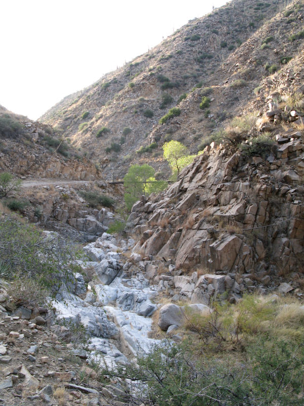 A view of a portion of Copper Creek below the Childs-Adwinkle Mine that still has stained green rocks from the copper workings: