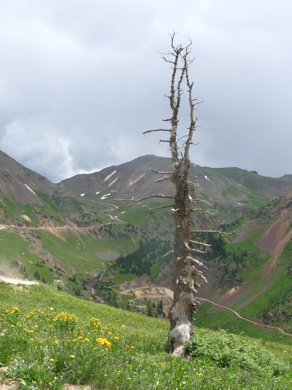 Here's the view looking down from our parking area. Red Mountain #2 on the left and Red Mountain #1 on the right. We stopped for the break about the center of the center of the photograph, and drove up the road to the right:
