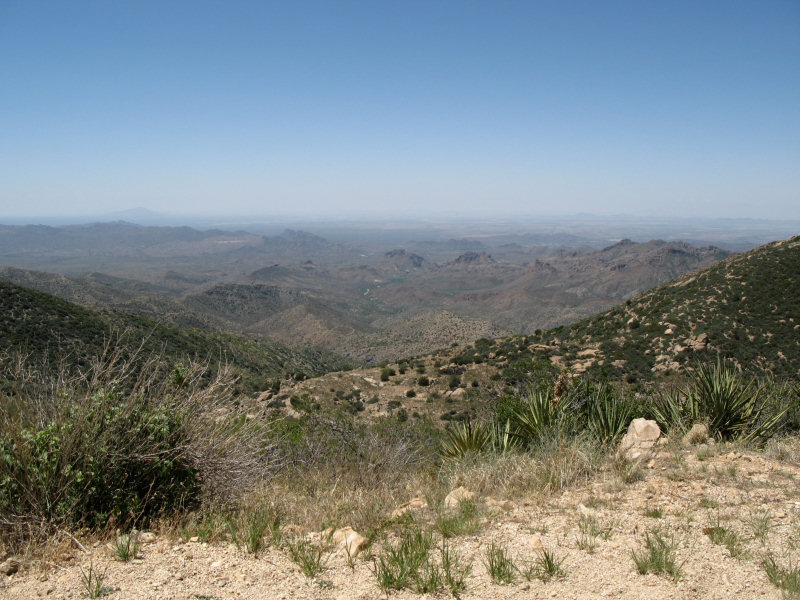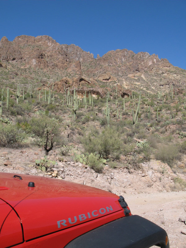 The Trail:This road is almost completely graded and easy to run. There are a few hairpin turns, wash crossings, and some optional easy obstacles. Along the way there is a natural arch and an old miners home and his mine. Rating:1.5 Runs:Date: 5/26/2008Suspension: Stock - front sagging 3/4" from bumper and winch with no liftPhotos:Heading up the West side of Montana Mountain - Roblas Butte to the right: