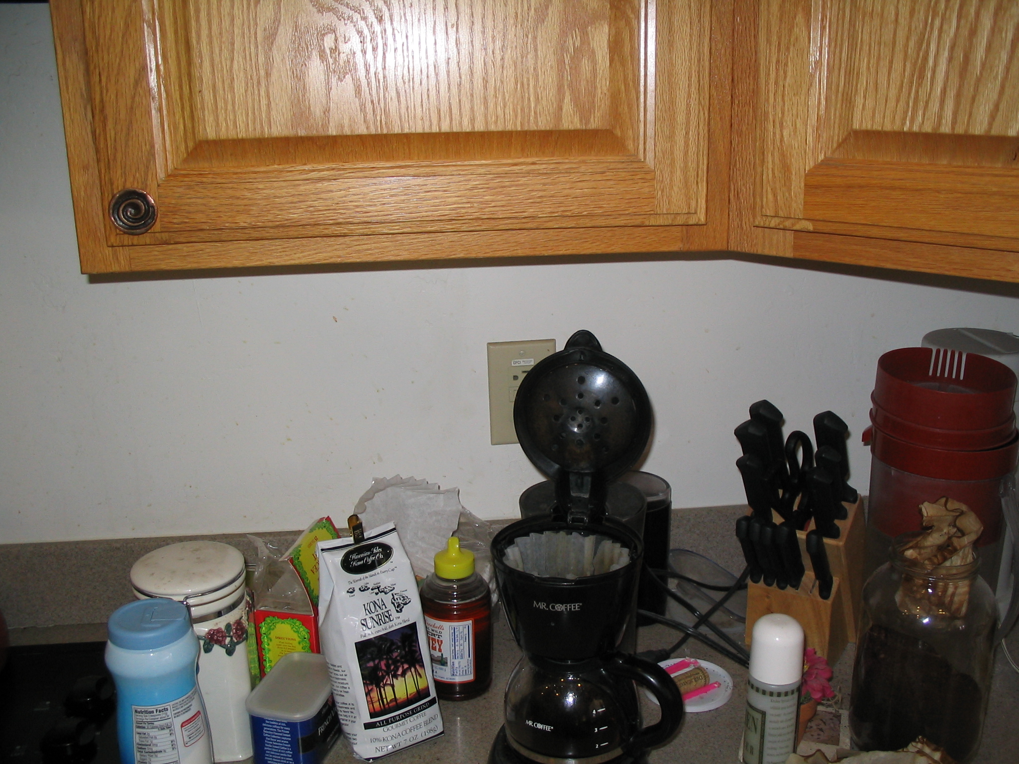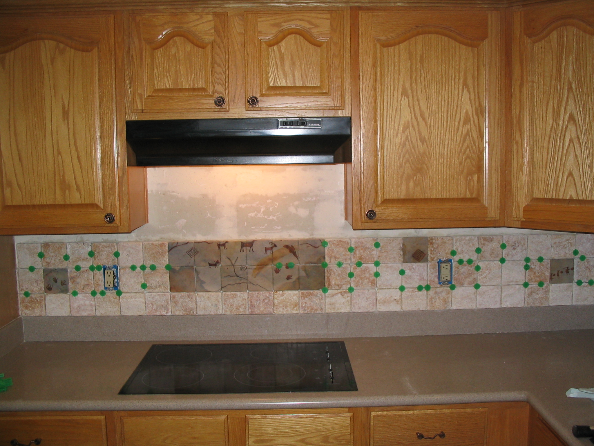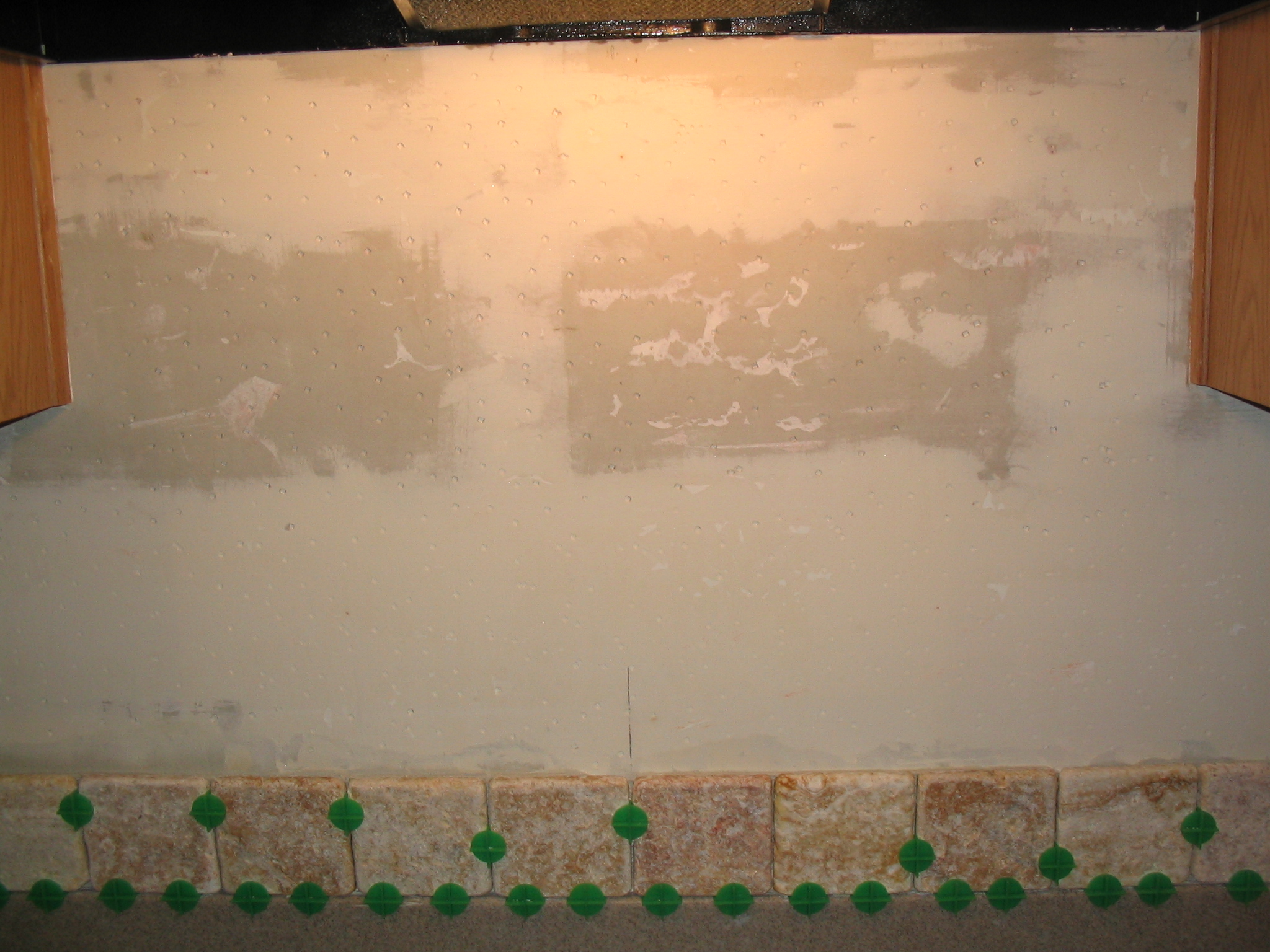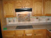 Backsplash before any work started Area cleared for work Paint stripped and wall roughed up First row of tiles installed 2nd row of tiles installed 3rd row of tiles installed 4th row of tiles installed (ran out of mortar on the right) 5th row of tiles installed Last row of tiles installed Ready to fill in the space with caulk (not grout) Caulked the edge and started on the right side Caulking complete (but not dry) Tile sealed, outlet covers painted Kitchen ready to be used again - finally!