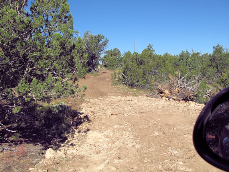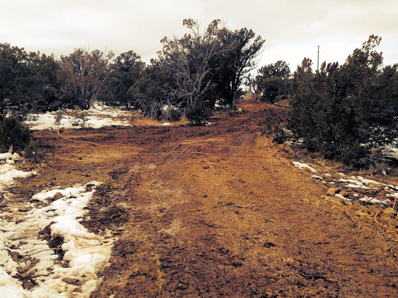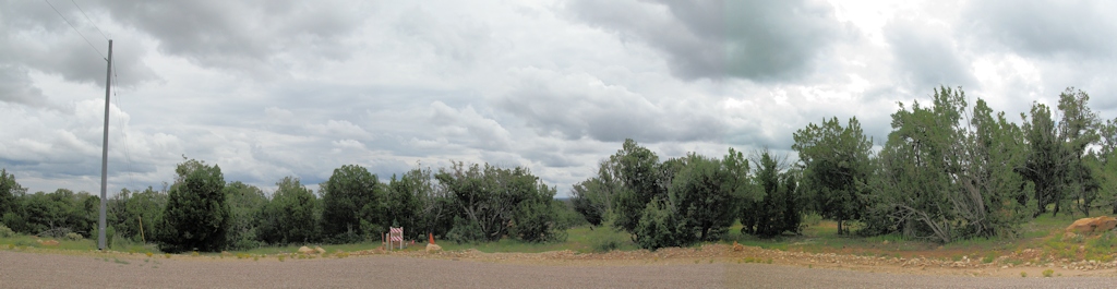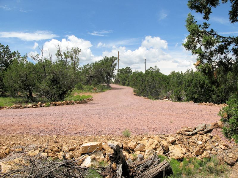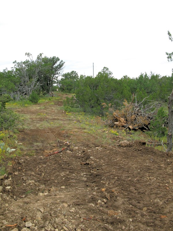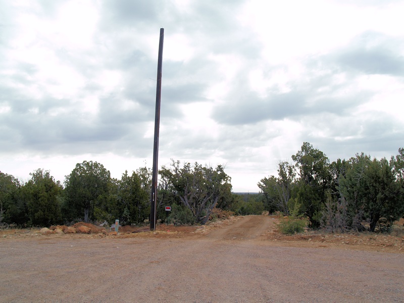 In the cul-de-sac looking toward the driveway entrance. A new pole will be set near the cone, and the driveway entrance/gap is in the center of the photo: