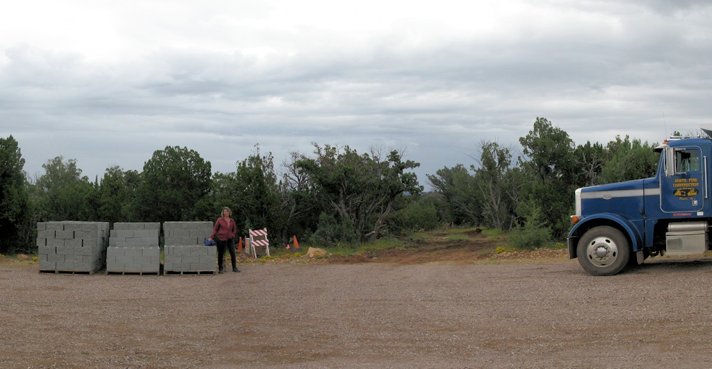 From the street looking down the driveway - they already delivered some block for the basement walls: